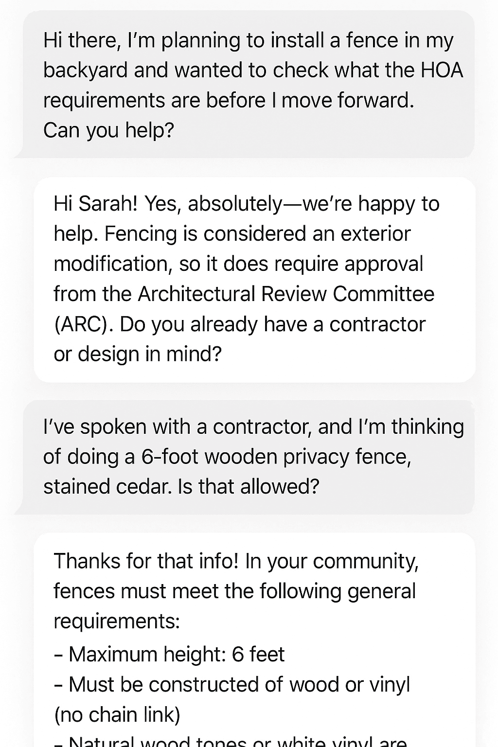 Adapts to your community’s unique needs, offering tailored responses based on your governing documents, CC&Rs, bylaws, and more.